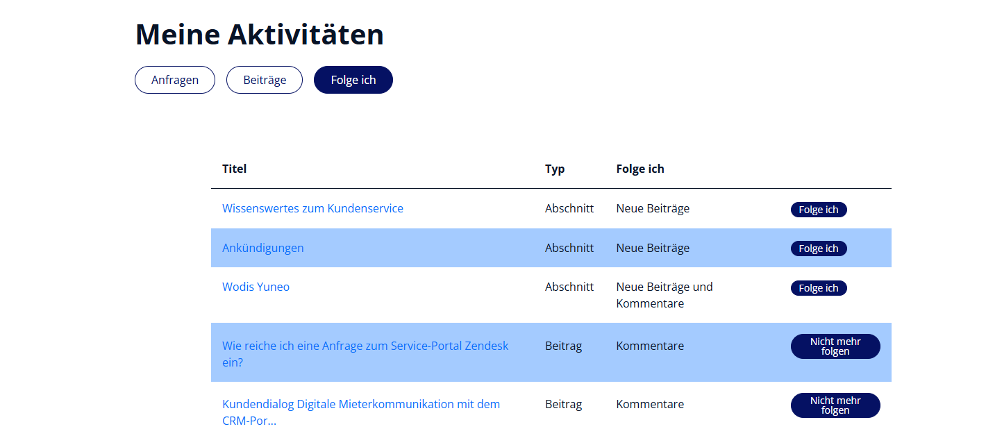 Als angemeldeter Benutzer kann man im Serviceportal sowohl einzelnen Beiträgen als auch auch einem ganzen Abschnitt folgen.