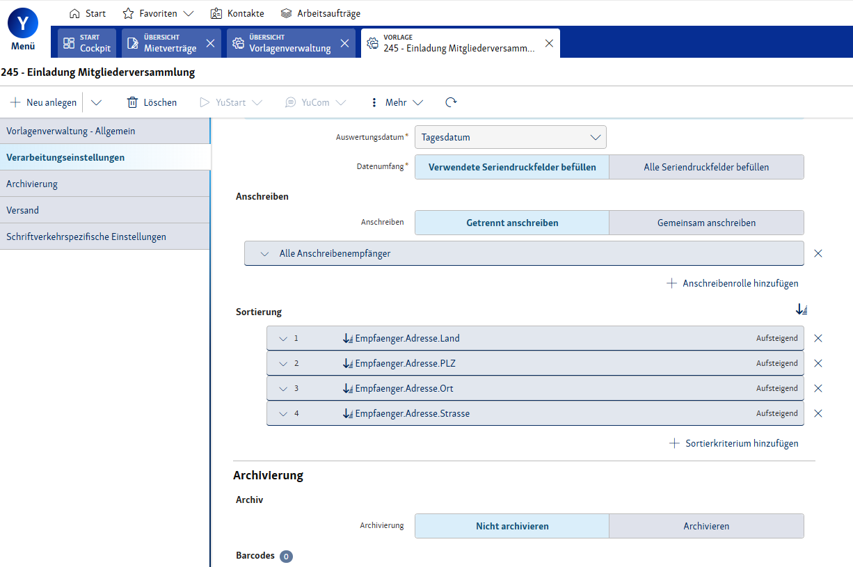 Sie müssen in die Vorlagenverwaltung und das Schreiben auswählen. Unter dem Punkt "Sortierung" können Sie Ihre Auswahl treffen. Ich füge mal ein Screenshot bei.