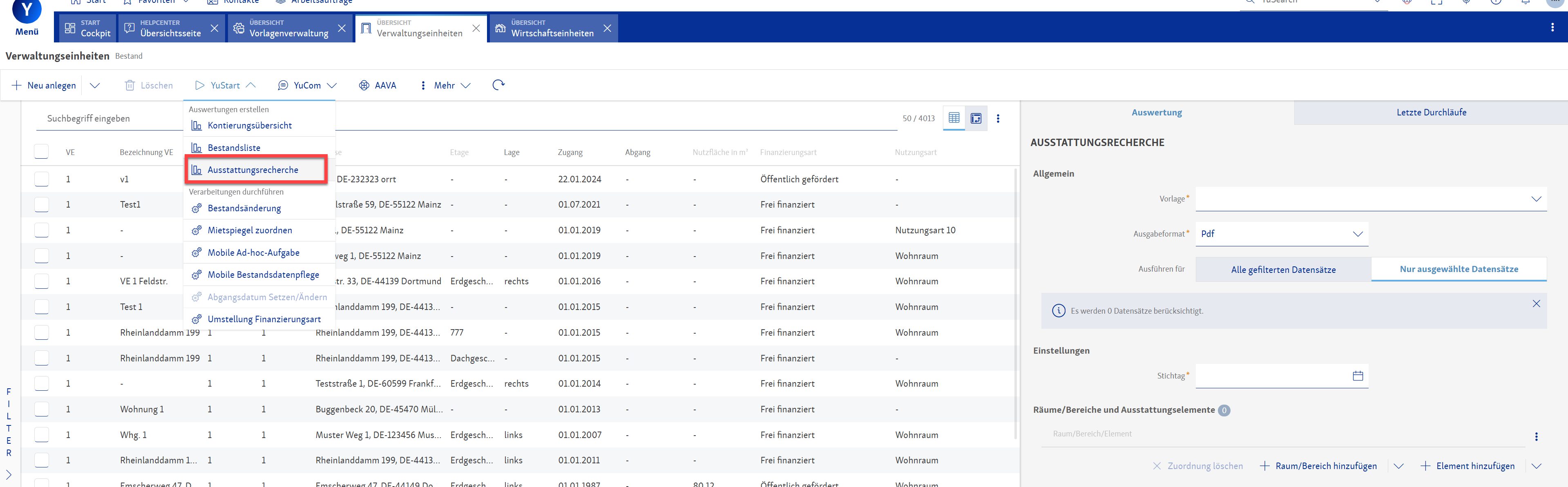 Ich muss für unsere Statistiken eine Liste/Auswertung der Ausstattung unseres Wohnungsbestandes erstellen. Leider finde ich in der Ausstattungspflege keine Möglichkeit dafür. Gibt es da eine Möglichkeit?
