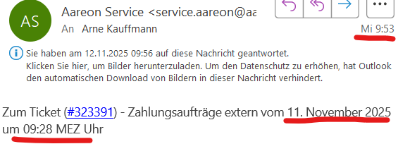 danke Ihnen und Ihrem Team! Tatsächlich erfolgte die Erfassung des Tickets um 9.28 Uhr und die Kontataufnahme um 9.53 Uhr.